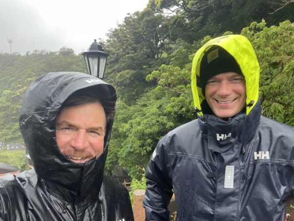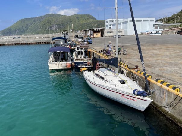 Interior of Santana, prepared for journey (Leg 1).Captains Burkosky and Langley strapped-in (Leg 1).Evan in full rain gear, safety harness, before departing (Leg 1).Hunkered-down in Habu Harbor, driving rain while stuck in-port (Leg 2).Circular Habu Port (a collapsed caldera that opens to the sea) (Leg 2).Sometimes treated with scrumptious food (Leg 2).Tied-up in Niijima Port (Leg 3).Exploring the volcanic island of Miyakejima (Leg 4).Chillin’ while attending to the many issues that naturally come-up while underway: sail repair, re-organizing quarters, drying things out. Note the rope-ladder for when the tide drops and we need to clamber onto the quay (Leg 4).Magical Miyakejima with other Izu islands in the distance (Leg 4).Still very active volcano in the center of the island: no-go zone encircling the center, smoke-spewing caldera (Leg 4).Spinnaker repair while in-port (Leg 4).Must-do bowlight repair while underway, heading into night-sail, rough seas (Leg 5).Always strapped-in while on-deck. Evan Burkosky (Leg 5).Centennial outcropping off Miyakejima. Strapped-in (Leg 5).Shimoda’s Iritahama Beach, where we anchored briefly after overnight sail of 16 hours (Leg 5).Santana tied-up at visitor’s berth in Admiral Perry Cove, Shimoda (Leg 5).Well-appreciated dinner & hydration after long soak in nearby onsen (Leg 5).Fortitude for next day’s 4:00 a.m. jaunt across both Sagami and Tokyo Bays, Soul Bar Tosaya… until 1:00 am (i.e., three-hour shut-eye)(Leg 5).Brisk sail under a sliver of a foresail, heading home after 7 days of sailing; 25~30 kh winds at our backs: hitting 6 knots for 12 hours (Leg 6)!Home Port Awa-Katsuyama on Chiba Peninsula! Whew (Leg 6)!